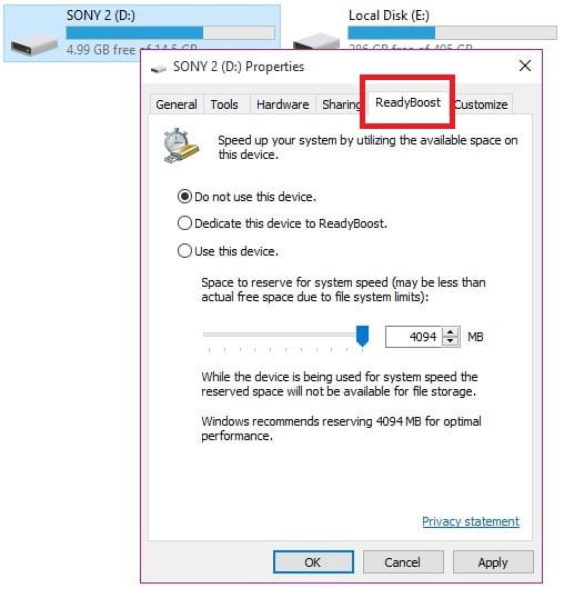 5. Go to the Ready Boost tab.